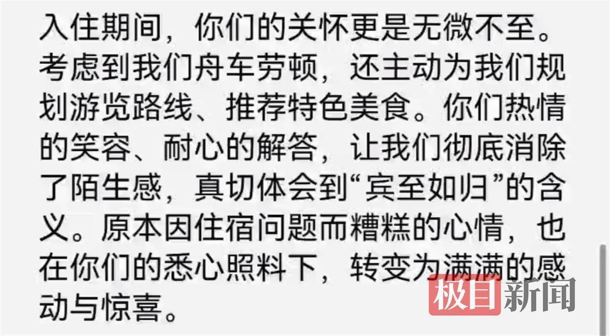 “底本倒霉的神色,在文旅局使命主说念主员全心经管下转为了满满的感动与惊喜……”黄雨中临别时给该局发送了一份感谢信。“宣恩很好,咱们下次还要来!”王女士暗示。