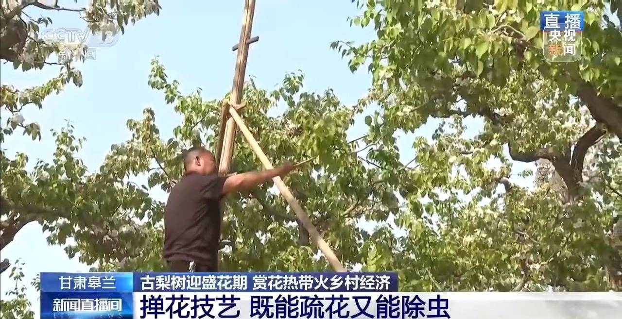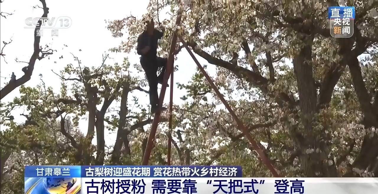 总台记者 崔林欣:梨花开放,授粉季也就到了。一般的果树,靠当然授粉约略蜜蜂授粉就不错,然而冬果梨当然授粉的坐果率唯一10%,是以必须东说念主工授粉,才智保证坐果率。当地果农到现时还保留着传统授粉花样。这里的梨树大宗能长到7到9米高,农户在给花授粉时会踩着古戏班传统用具——云梯。