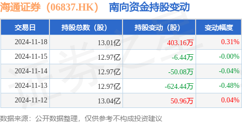 本站讯息,11月18日南向资金增抓403.16万股海通证券(06837.HK)。近5个交游日中,获南向资金减抓的有3天银河官方网站澳门app娱乐,累计净减抓226.84万股。近20个交游日中,获南向资金减抓的有15天,累计净减抓3363.92万股。戒指现在,南向资金抓有海通证券(06837.HK)13.01亿股,占公司已刊行粗俗股的38.14%。
