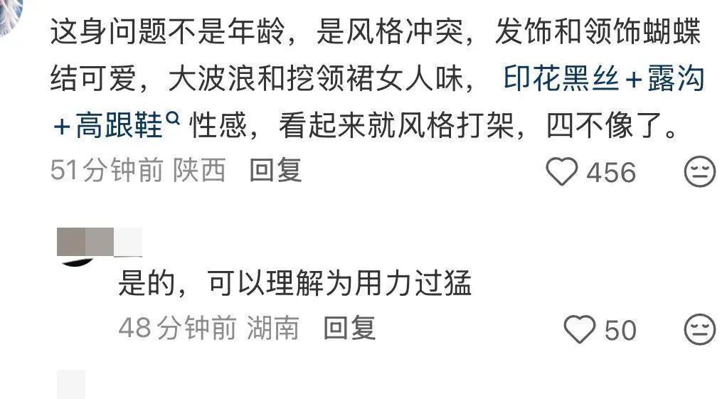 有东说念主认为,林志玲的气质蓝本就属于优雅、和缓的路数,造型团队反倒在“青娥感”和“熟女柔媚”之间扭捏,着力碰出了“怪方法”的怪方法。前卫圈有句不太友善的话:“作风不一致,容易形成失败的实验。” 林志玲的新造型,也许等于这个前卫表象的最佳刺眼。