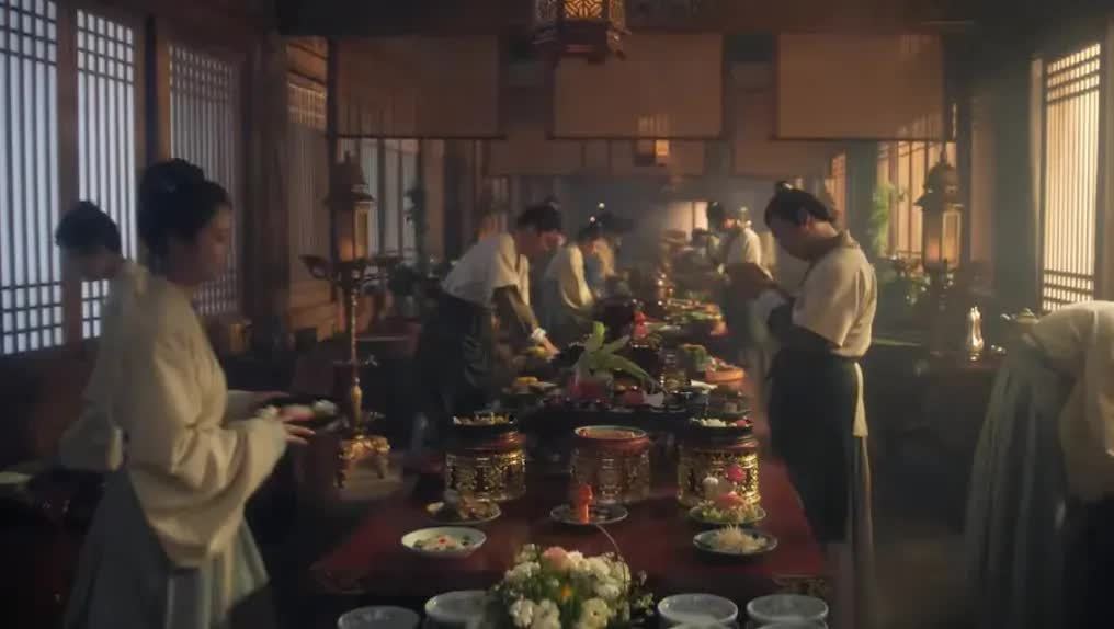 内部许多画面都很细腻,比如这个后厨的画面,食材极新,画面东说念主物看起来紧凑细腻,俨然让不雅众身临富丽堂皇的宫廷生计中。