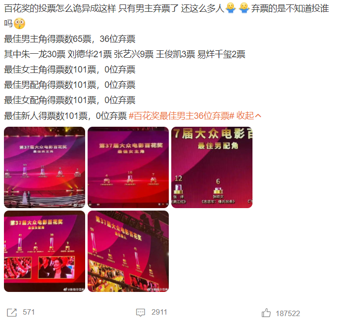 当越来越多的网友运转崇拜王俊凯赢得3票,易烊千玺赢得2票的时刻,扫视的网友发现百花奖最好男主角的票数总和似乎不太对,总和是101票,朱一龙赢得30票,刘德华赢得21票,张艺兴赢得9票,大众加起来之后,还差36票,这么的情况出现后,网友运转探听究竟是若何回事。