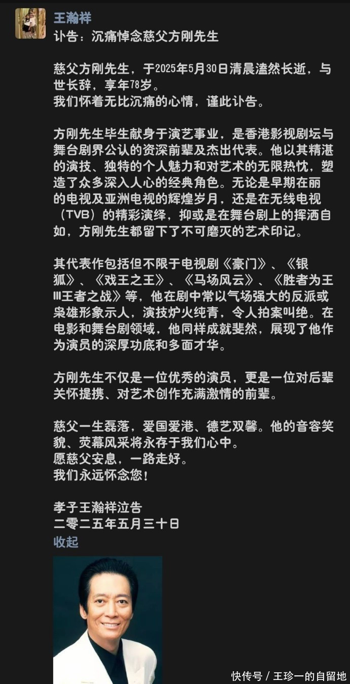 这一音书真是属实,因为寰球很快就看到了王瀚祥发布的干系方刚的讣告。
