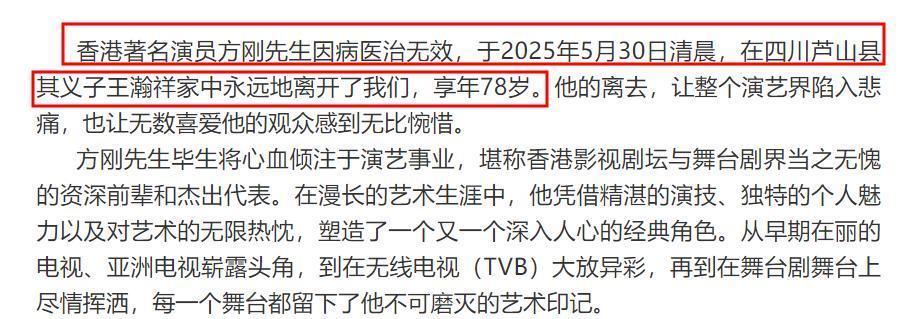 把柄芦平所在志的报谈可知,方刚因病于2025年5月30日黎明,在芦山县其义子王瀚祥家中离世,享年78岁。