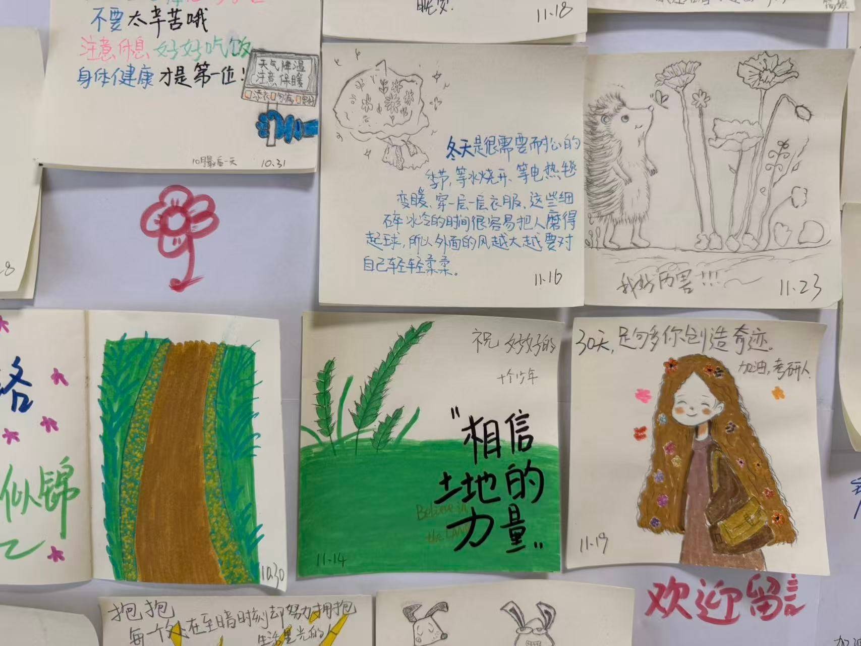 12月5日,九派新闻记者来到中南民族大学南区26栋寝室楼看到,公告栏挂满了在便利贴上绘图的画作,每幅画皆配了励志案牍,还有同学驻足阅读不雅看。底本这是学生社区辅导员郭曼,用一支铅笔、一块橡皮和几支彩色笔,在寝室楼的公告栏上勾画出的50余幅暖心画作。小小的便利贴画作配上调养案牍,这成为了考研学子冲刺路上的景观线。