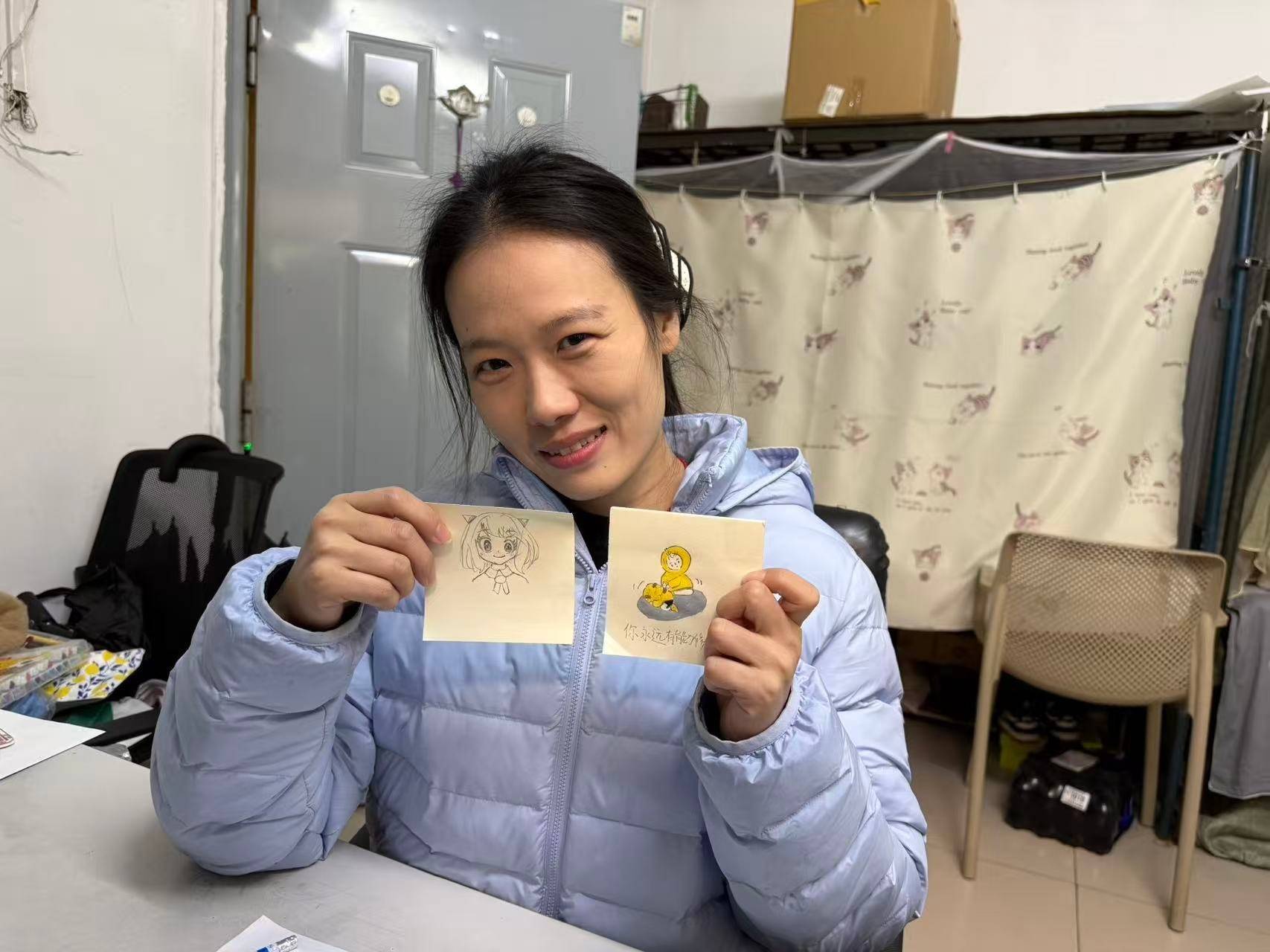 这些作品立场相反,创作时长也不尽交流。浅薄的状貌指点画作 “一笔就能画掉”,而那些色彩、大小奋力一致的系列画作,或是贴合学子喜好的动漫立场作品,则需要消耗更多心想。除了励志主题,她还会创作请示学子 “睡好觉”,“明慧御寒” 的活命化作品,让关爱浸透到日常点滴。