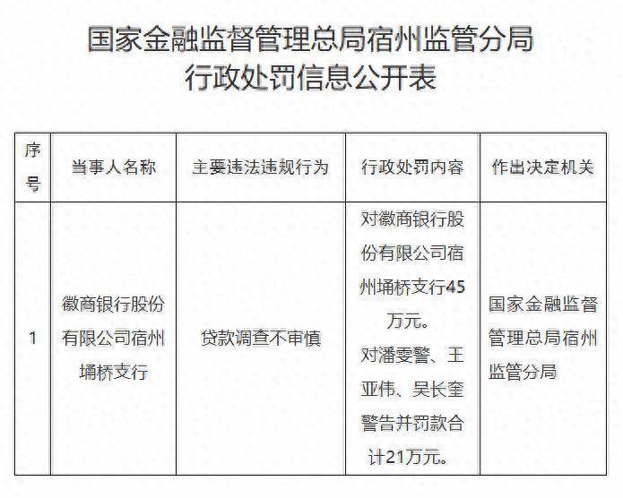 【大河财立方音问】12月16日银河官方网站澳门app娱乐,国度金融监督处置总局宿州监管分局表现的行政处罚信息公开表表现,因贷款探望不审慎,徽商银行股份有限公司宿州埇桥支行被罚45万元。